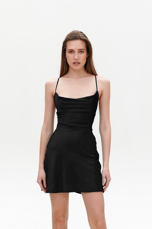 Black Slip Mini Dress – Elegant Satin Short Dress with Cowl Neck