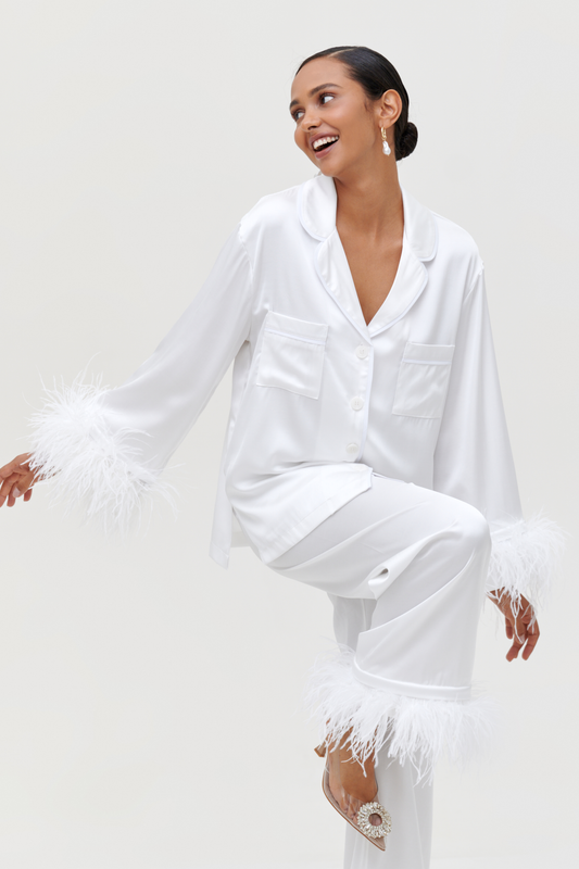 White Feather Pajamas – Luxury Satin 2-Piece Nightwear Set