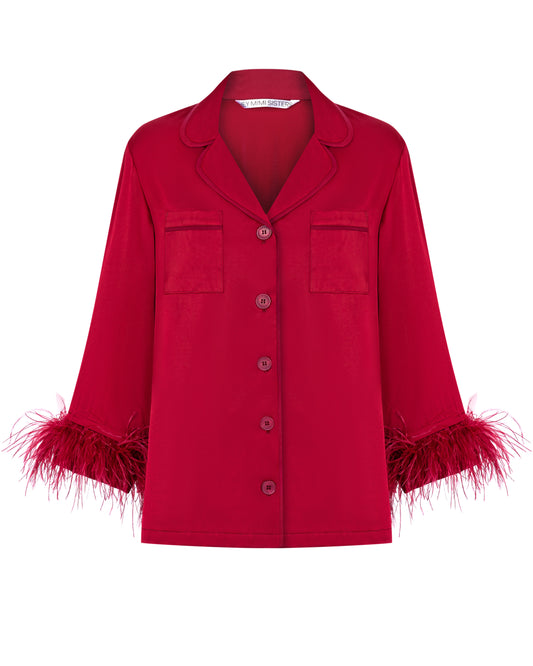 Burgundy Feather Pajamas – Luxe Satin Two-Piece Set