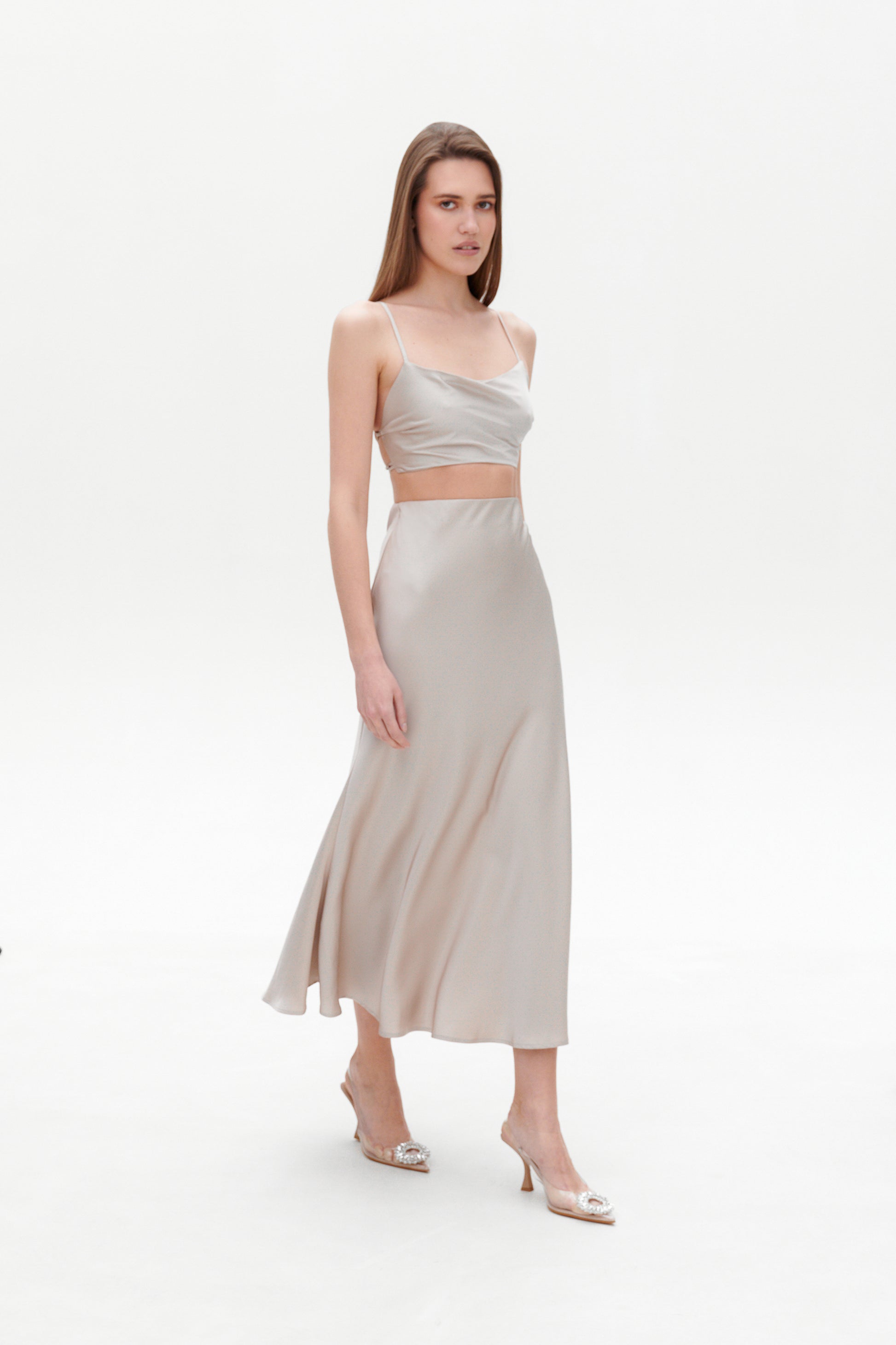 Beige Satin Skirt – Elegant High-Waist Midi Satin Skirt