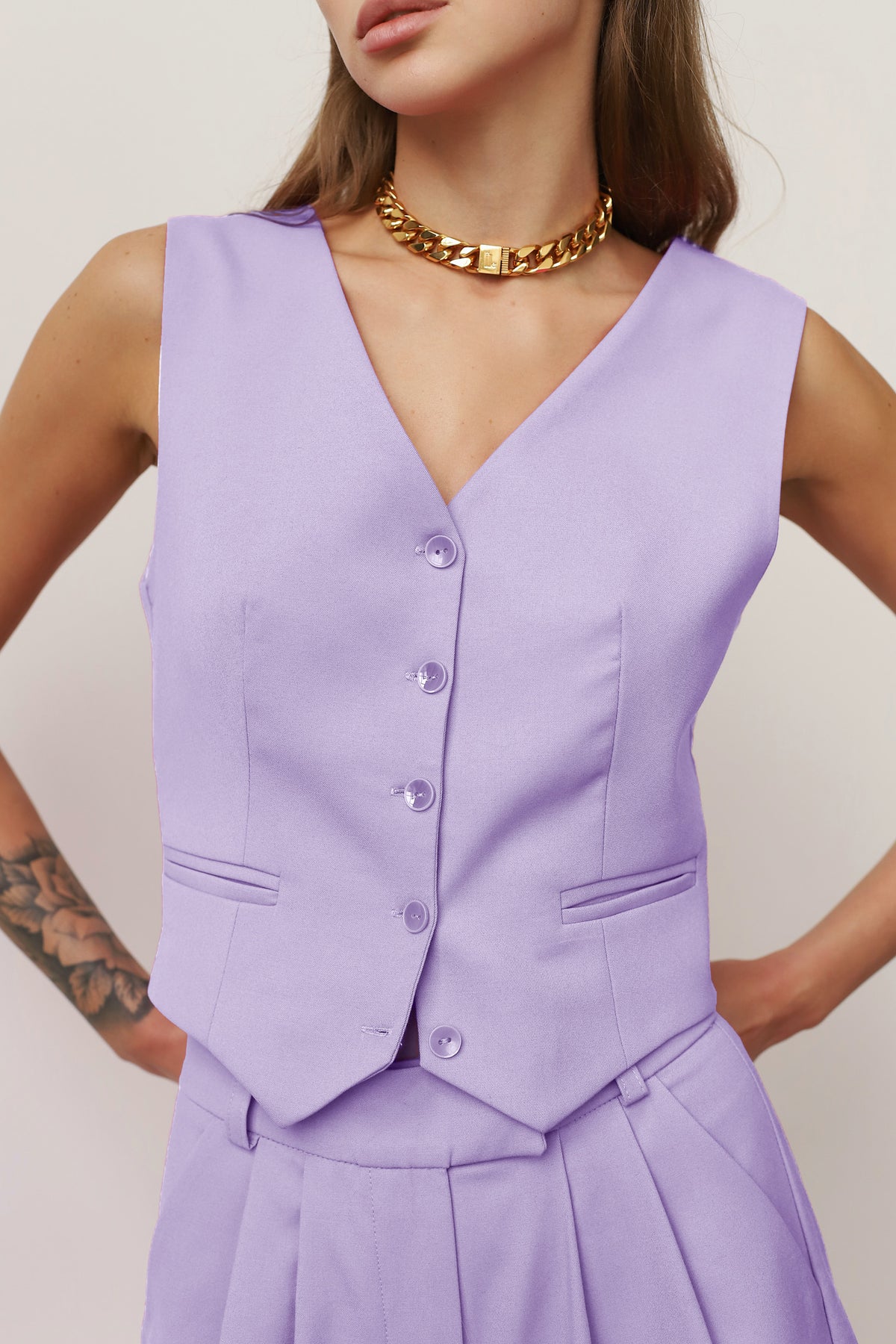 • Tailored vest with a sharp V-neckline