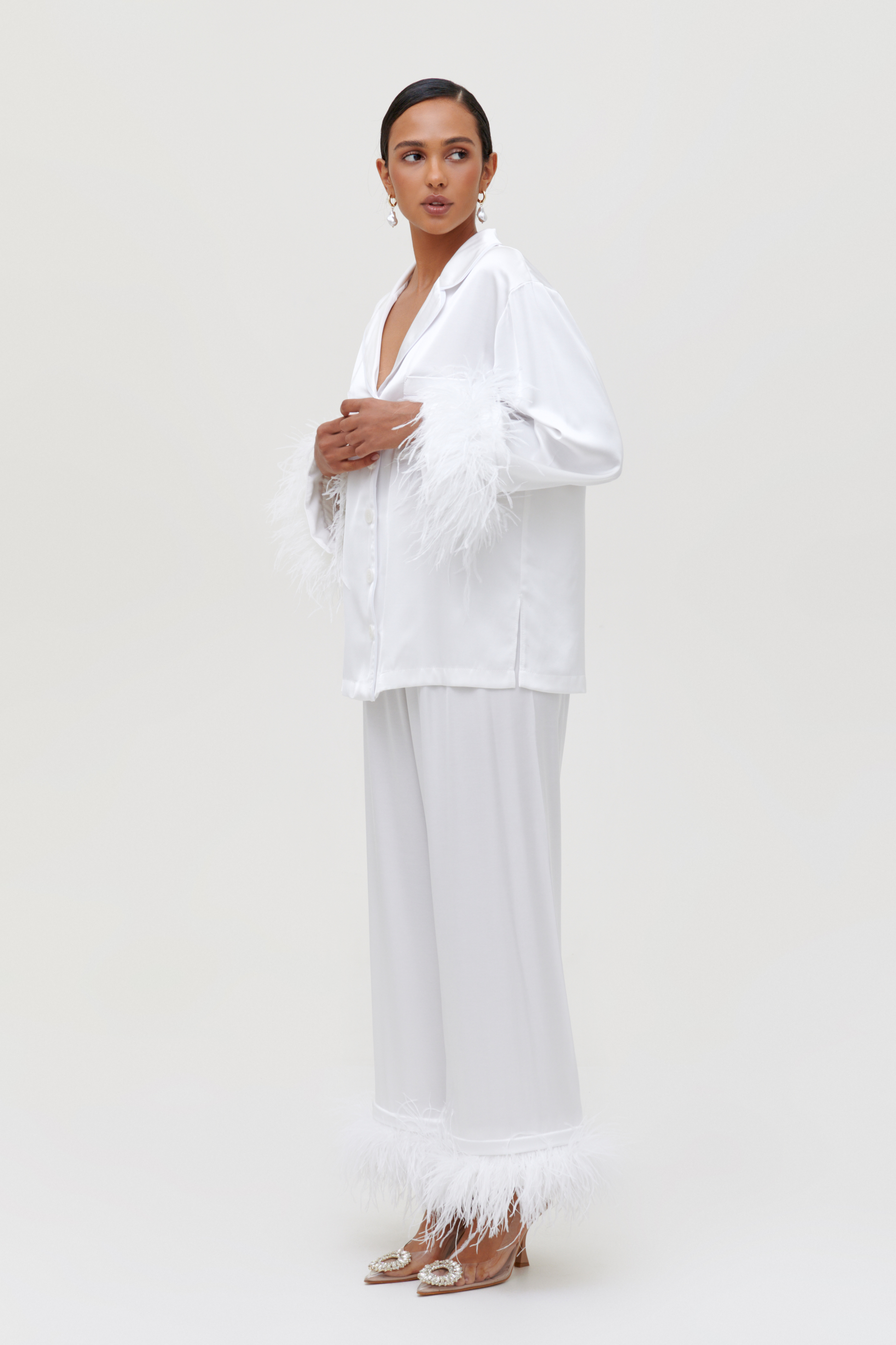 White Feather Pajamas – Luxury Satin 2-Piece Nightwear Set
