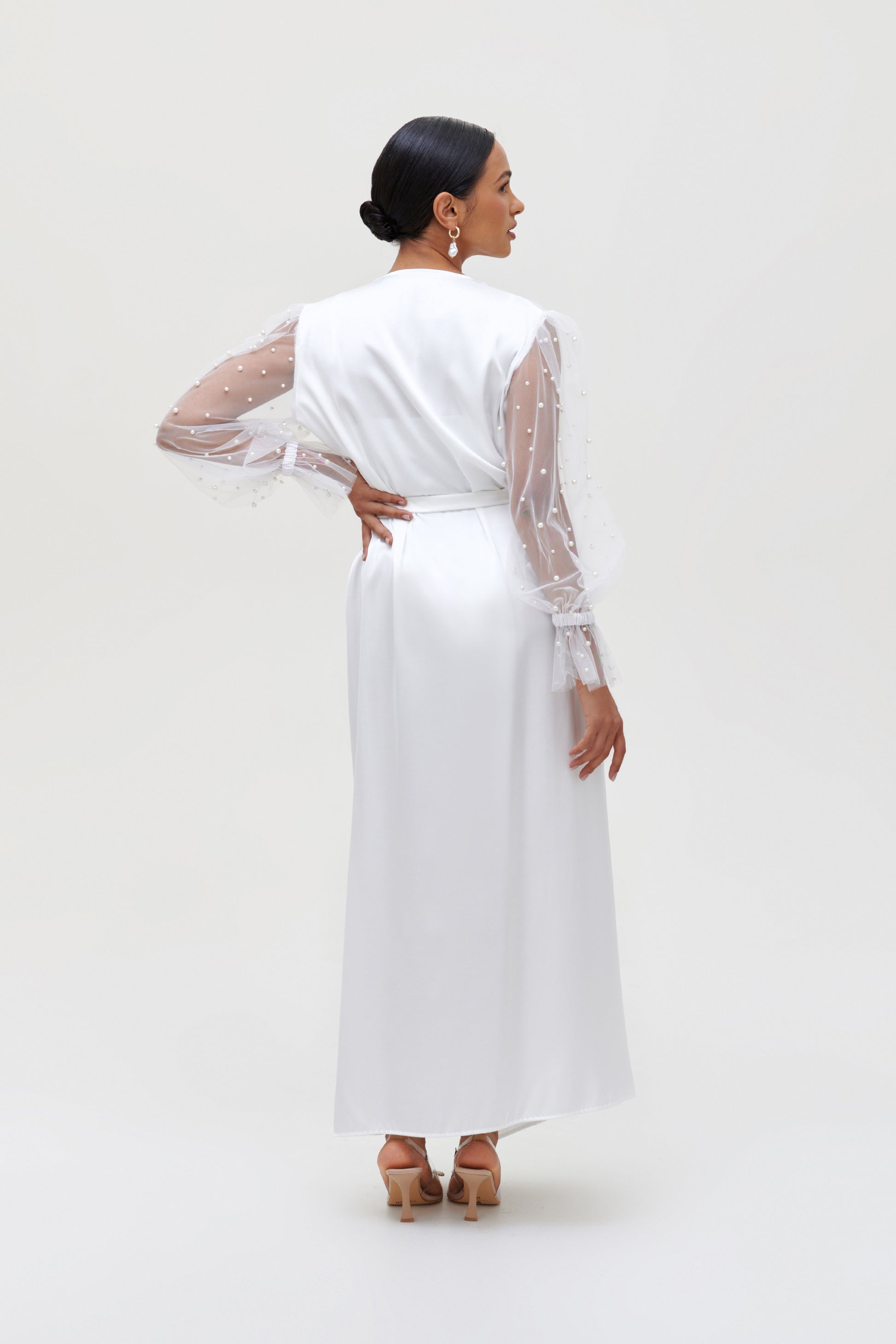 White Pearl Bridal Robe – Satin Wedding Robe with Sheer Sleeves